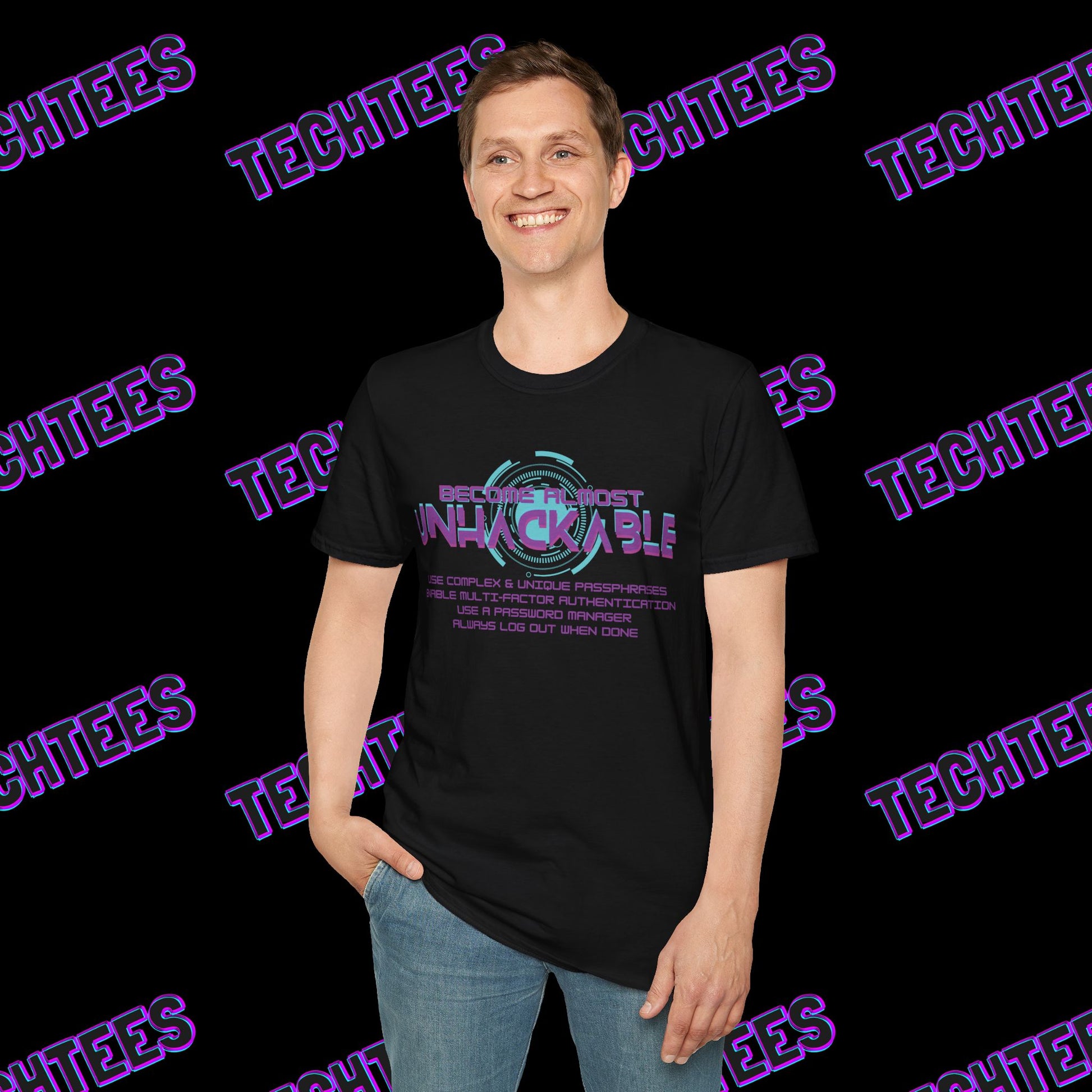 Elevate your cybersecurity game with the Become Almost Unhackable t-shirt. This standout design features bold, futuristic text combined with key security tips—reminders to use complex passwords, enable multi-factor authentication, and always log out—making it not just a shirt but an educational tool for tech-savvy professionals.