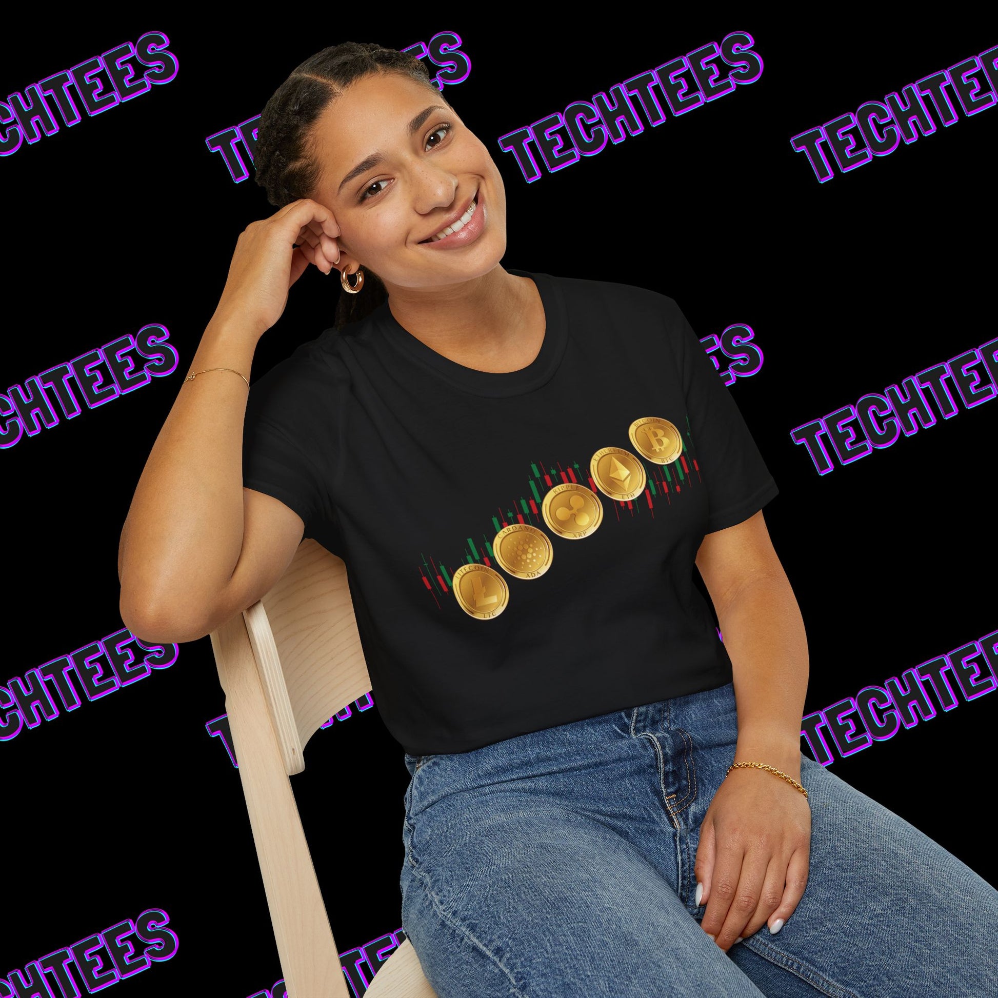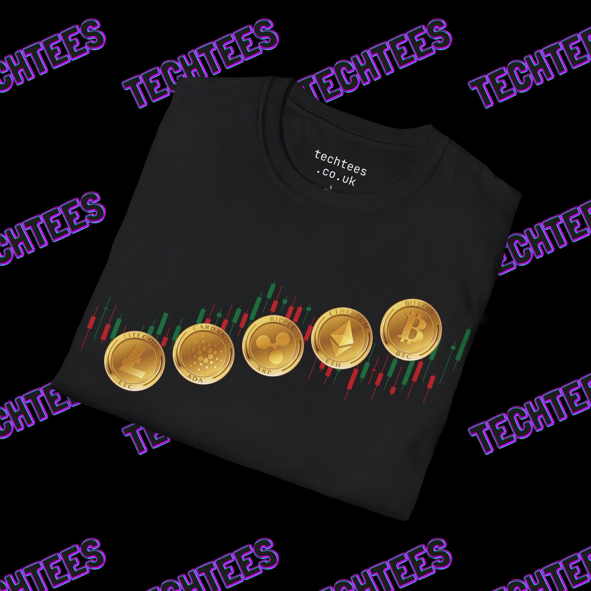 The unique design features a classic bullish candlestick chart, a familiar sight for anyone in the trading world. Prominently displayed are some of the most popular and influential cryptocurrencies, including Bitcoin (BTC), Ethereum (ETH), Ripple (XRP), Cardano (ADA) and Litecoin (LTC). This t-shirt is more than just apparel; it's a statement piece that connects you with the fast-paced, innovative world of blockchain-based digital finance.