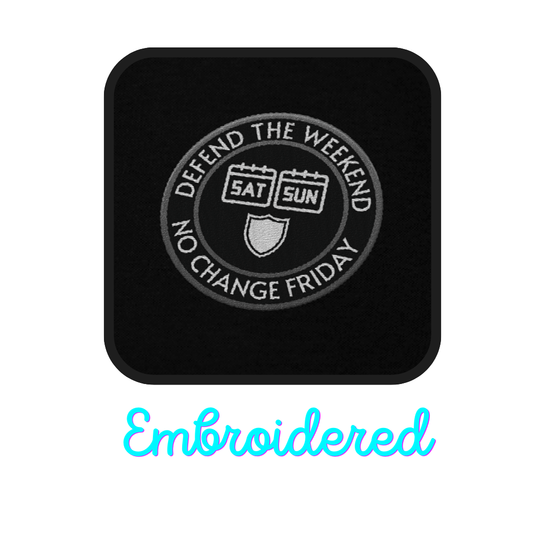 Clean, Tech-Savvy Design: "Defend the Weekend – No Change Friday" embroidery that resonates with the IT crowd