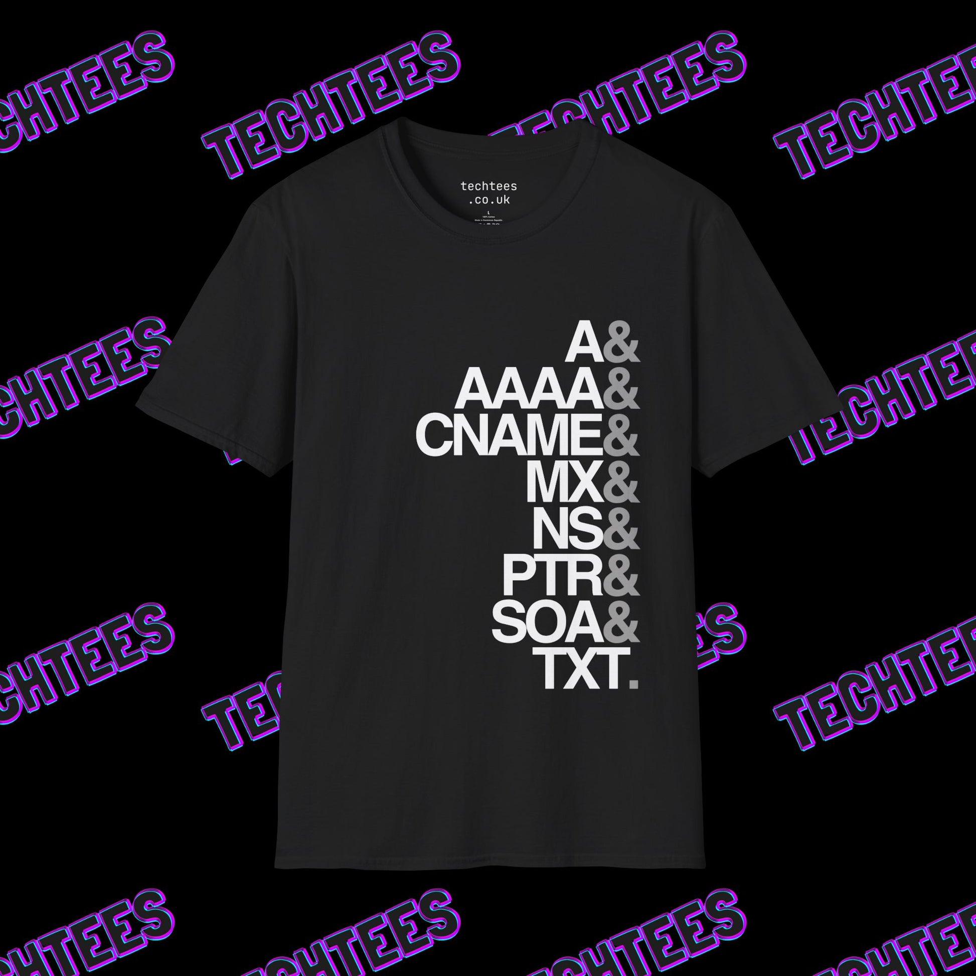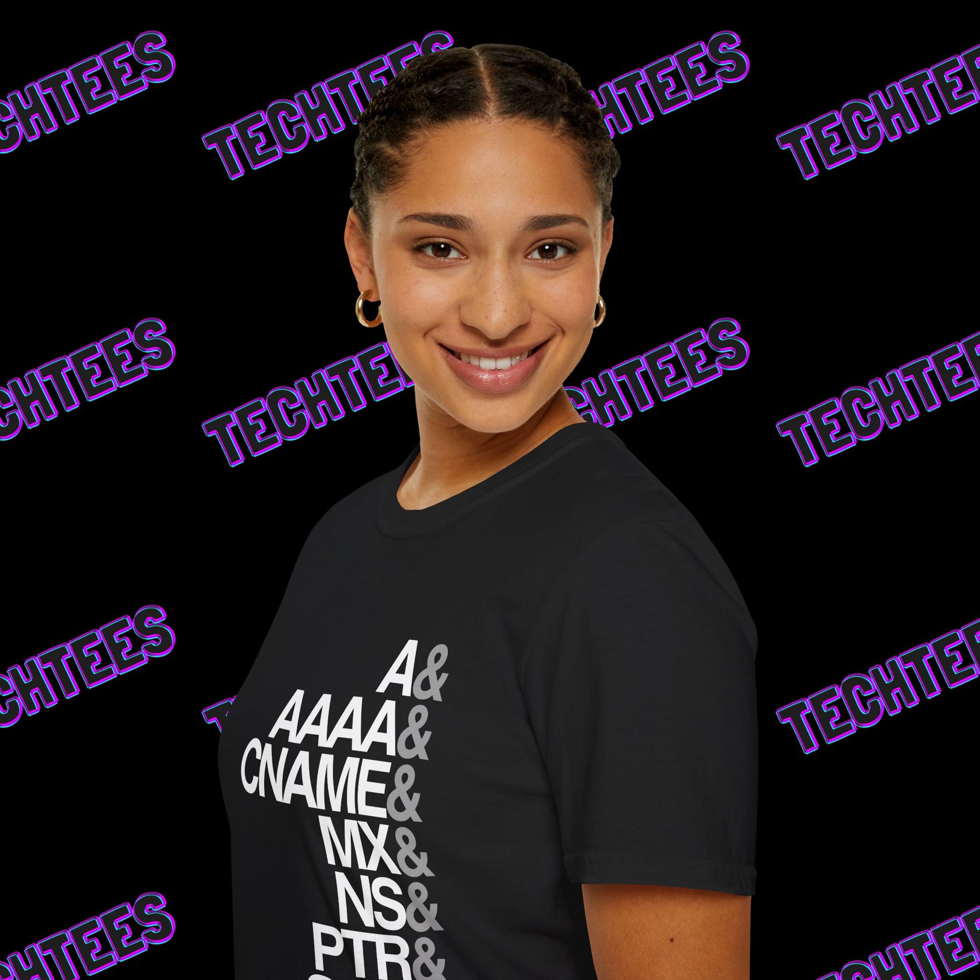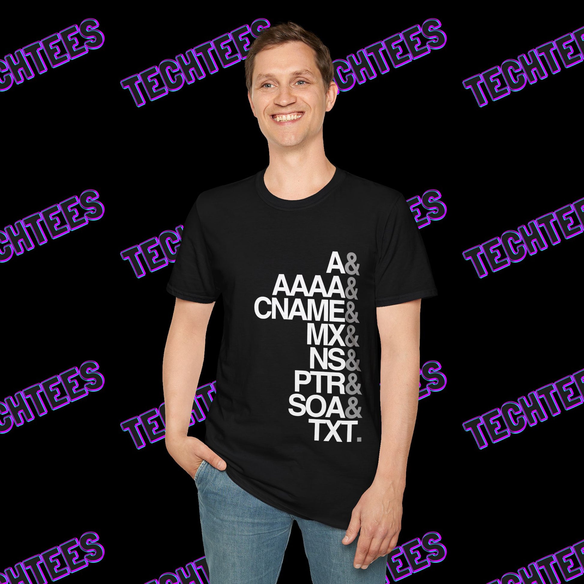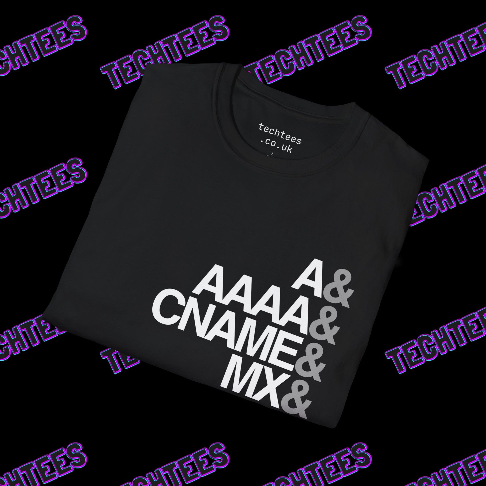 It's always DNS. Our DNS Records t-shirt features a clean, classic design showcasing the most common DNS record types—A, AAAA, CNAME, MX, NS, PTR, SOA, TXT—in Helvetica font, this shirt is perfect for IT professionals, network engineers, and sysadmins who understand the importance of DNS