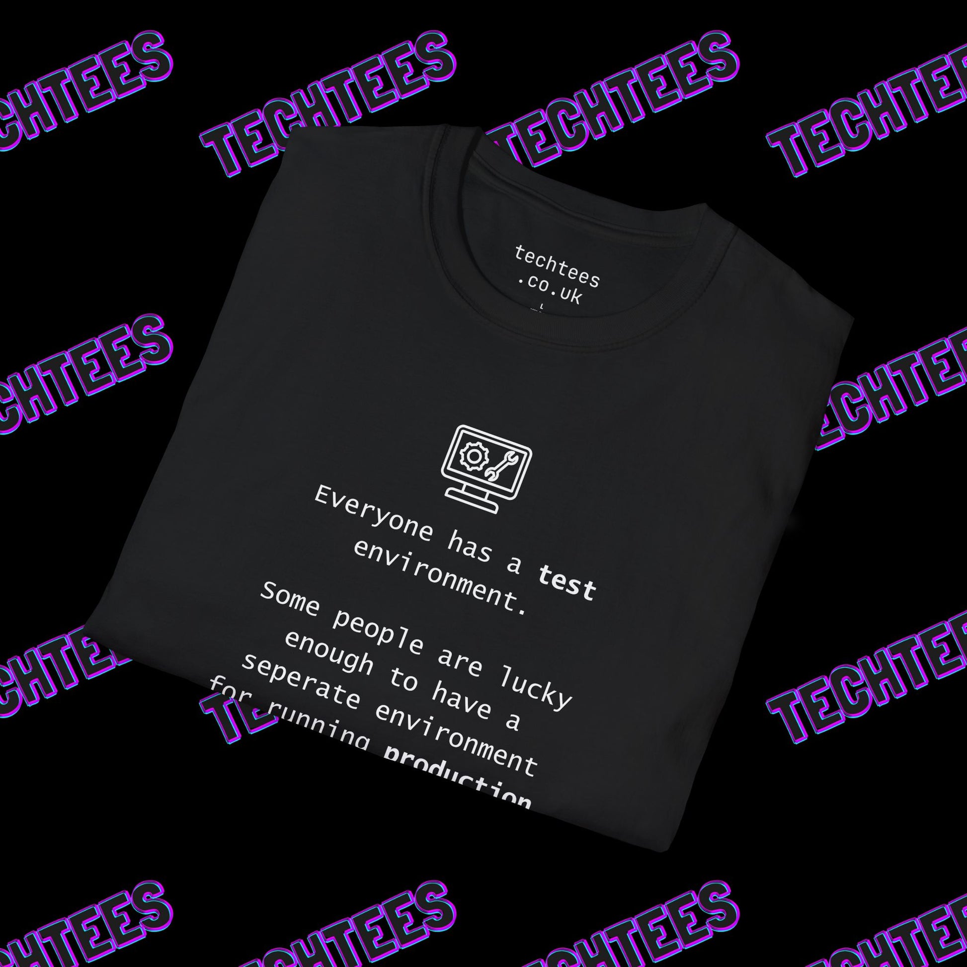 Celebrate your inner techie with the Test vs. Production Environment T-Shirt, a clever nod to the realities of software development and IT operations. Perfect for developers, sysadmins, and DevOps engineers, this premium cotton tee highlights the painfully true situation, especially in legacy environments, where the lines between test and production are often blurred. The humorous text captures the struggle of those lucky enough to have separate environments for testing and production.