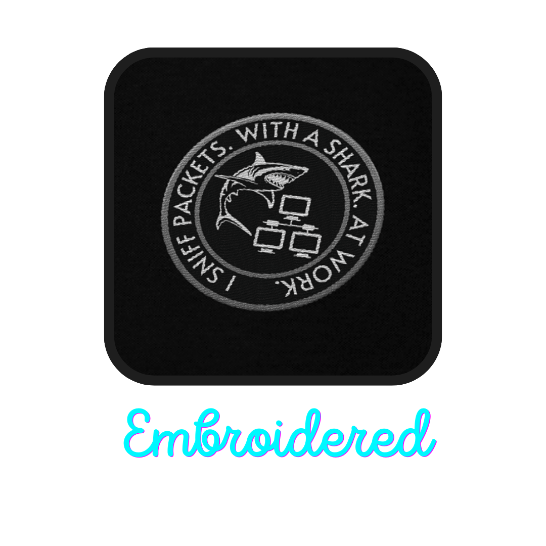 Witty, Double-Meaning Design: "I Sniff Packets. With a Shark. At Work." embroidery, perfect for those with a sharp eye on both network security and humour