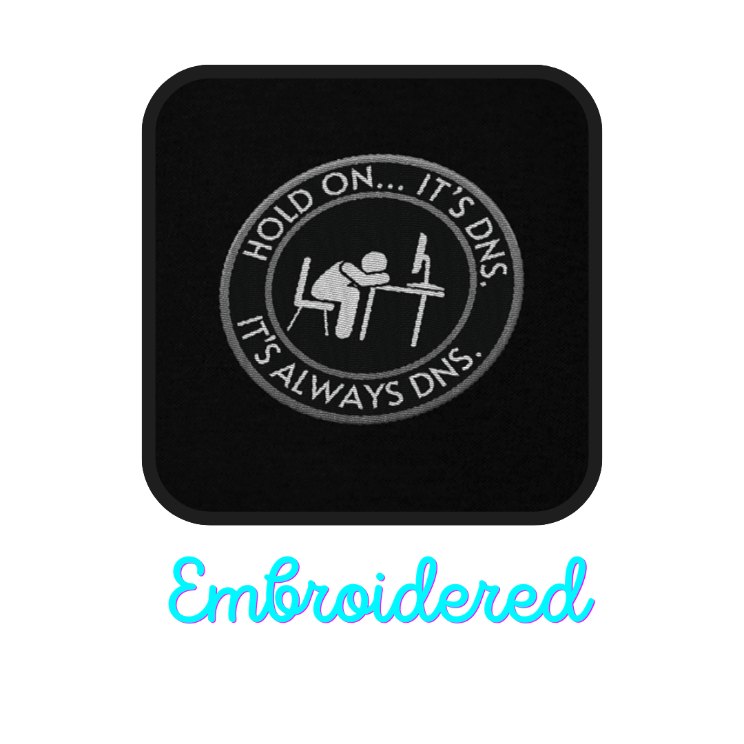 Humorous, Relatable Design: "It’s Always DNS" embroidery that will make your fellow IT pros nod in agreement