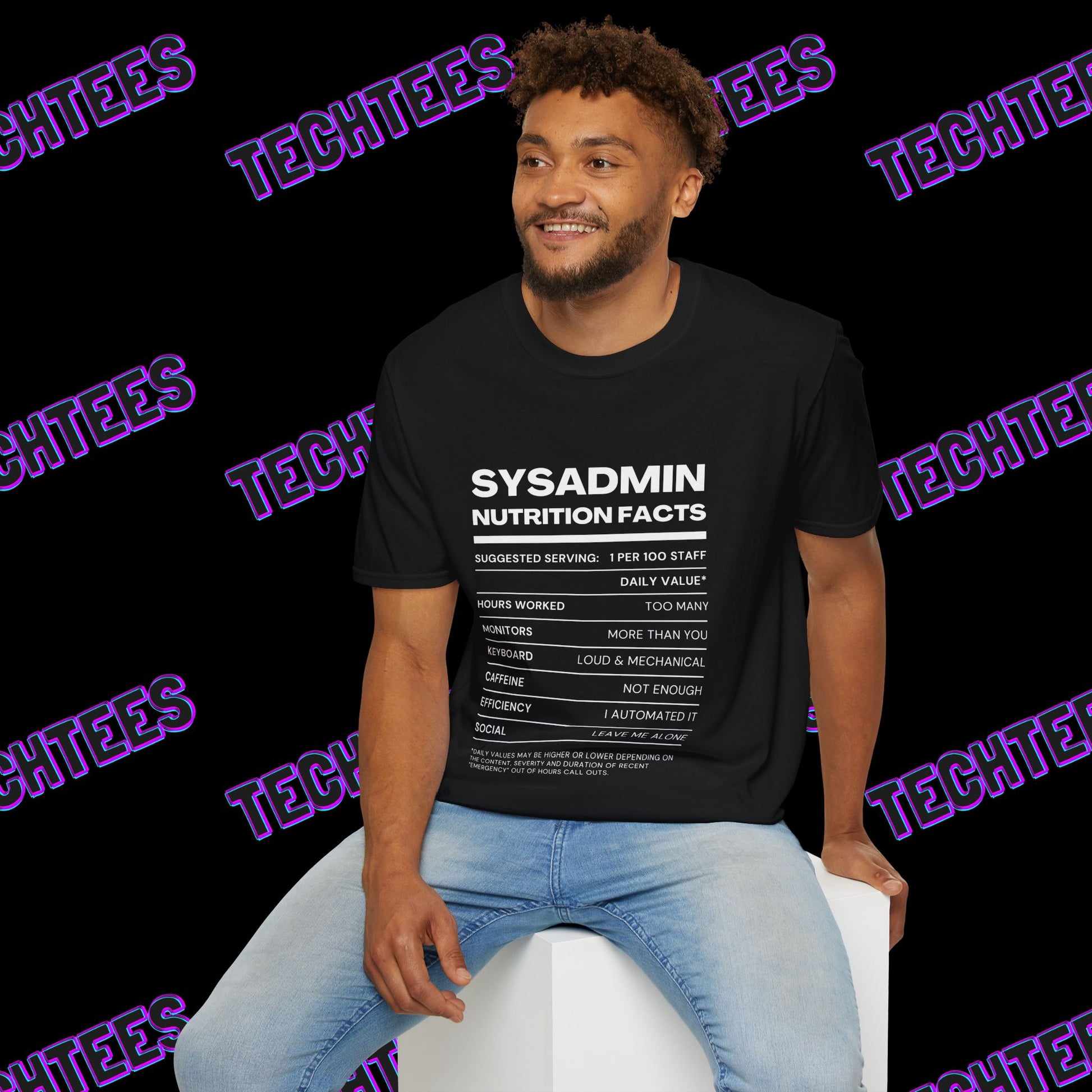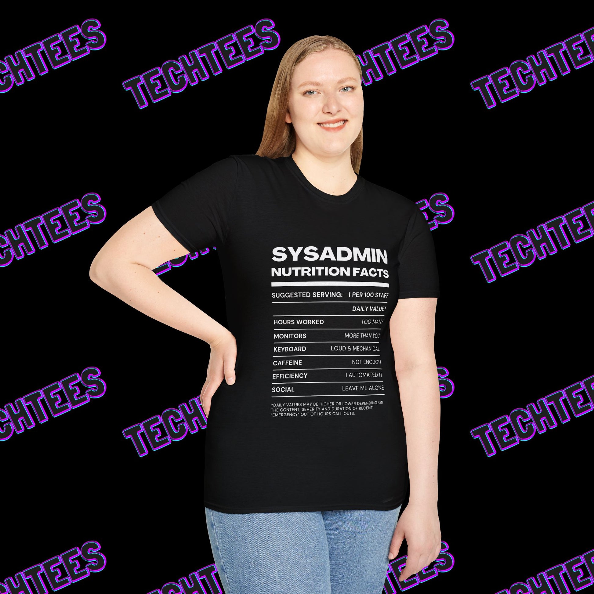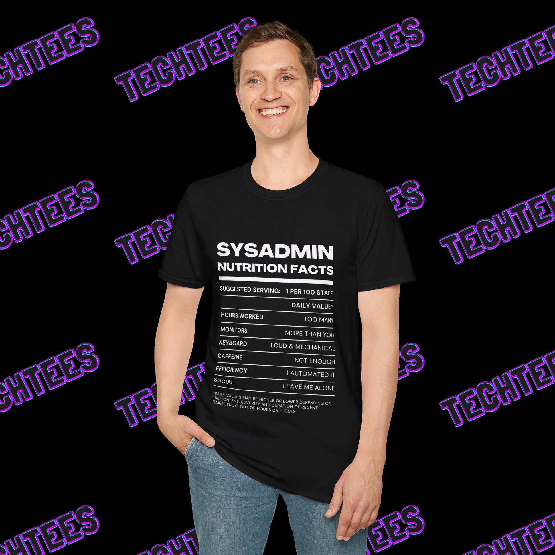 - Unique Design: Tech-inspired "SysAdmin Nutrition Facts" print